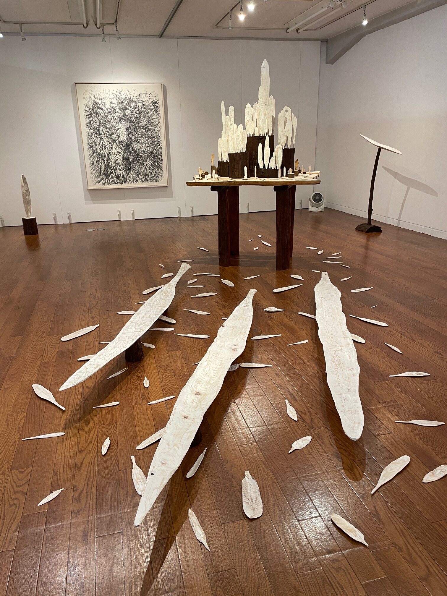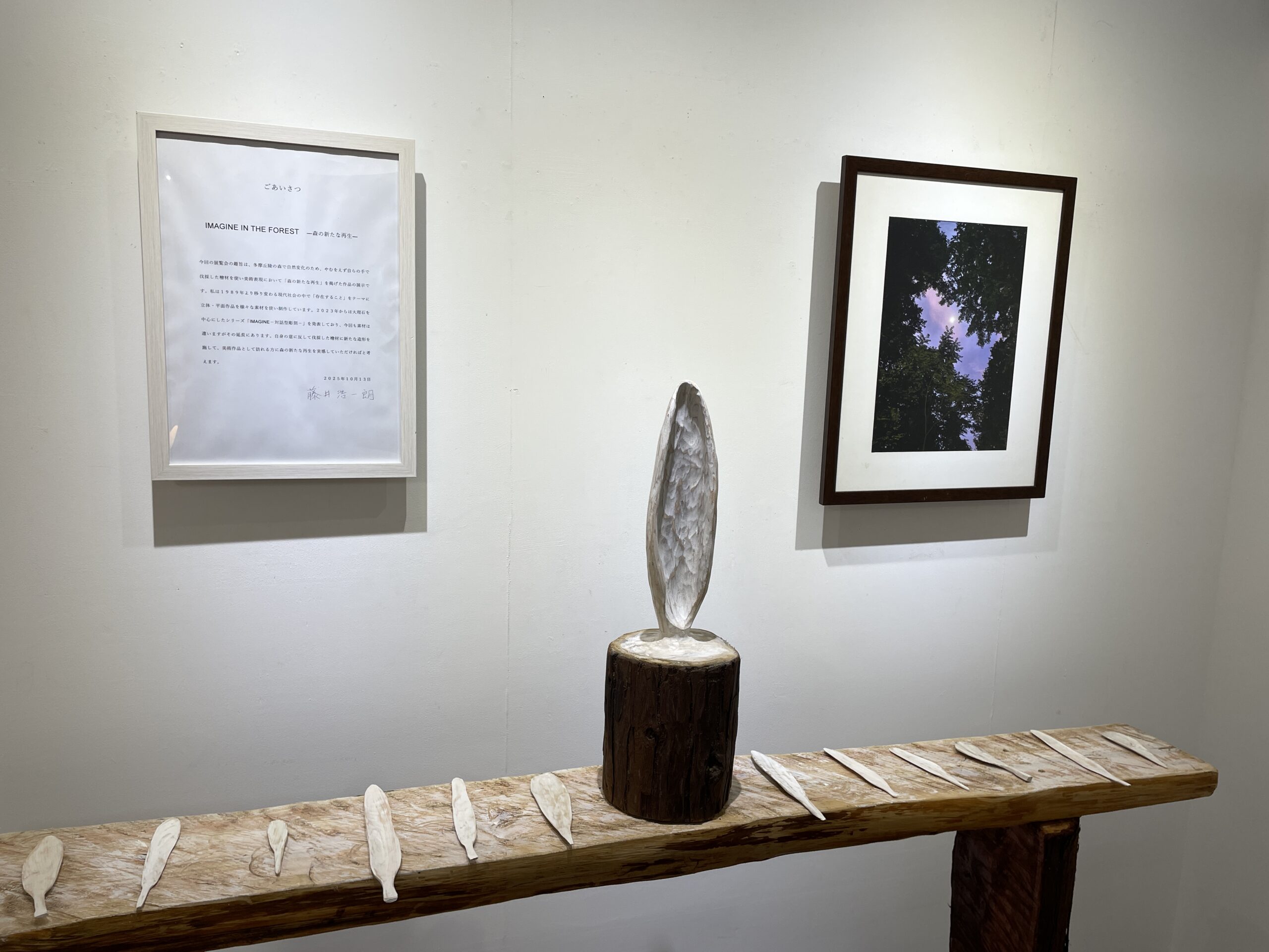 今回の展覧会の趣旨は、多摩丘陵の森で自然変化のため、やむ負えず自らの手で伐採した檜材を使い美術表現において「森の新たな再生」を掲げた作品の展示です。